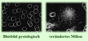 | Mithilfe eines speziellen Mikroskops ( Dunkelfeld ) wird ein direkt entnommener Blutstropfen - z.B. aus dem Finger- über einen längeren Zeitraum beobachtet. Sowohl der erste Eindruck als auch die Veränderungen im Laufe von Stunden werden für eine Bewertung herangezogen. Das Verfahren ist streng genommen keine wissenschaftliche Methode, sondern beruht ähnlich wie bei der Augendiagnose auf der Erfahrung des Therapeuten. |